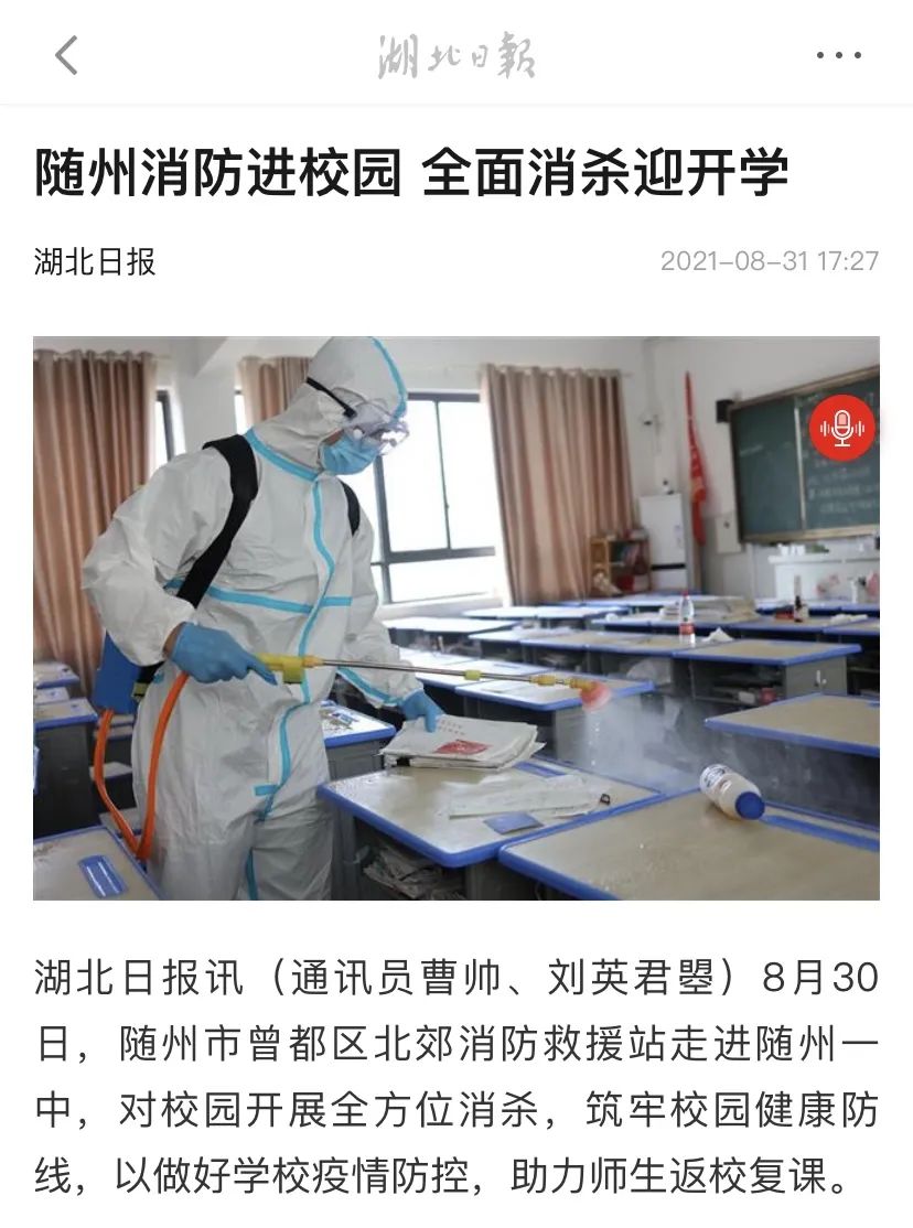 8月30日,随州市曾都区北郊消防救援站走进随州一中,对校园开展全方位消杀,筑牢校园健康防线,以做好学校疫情防控,助力师生返校复课。