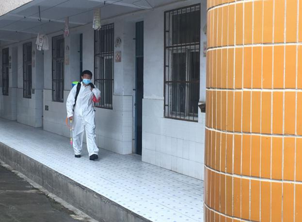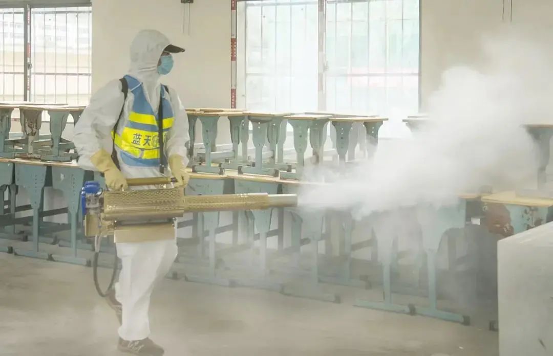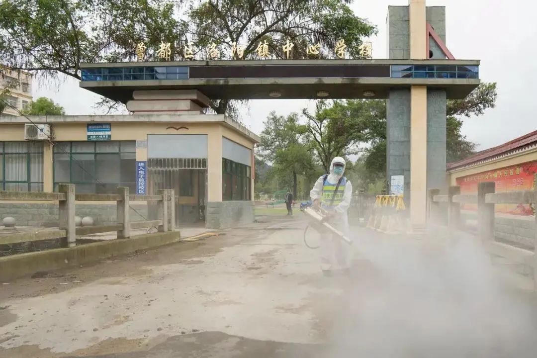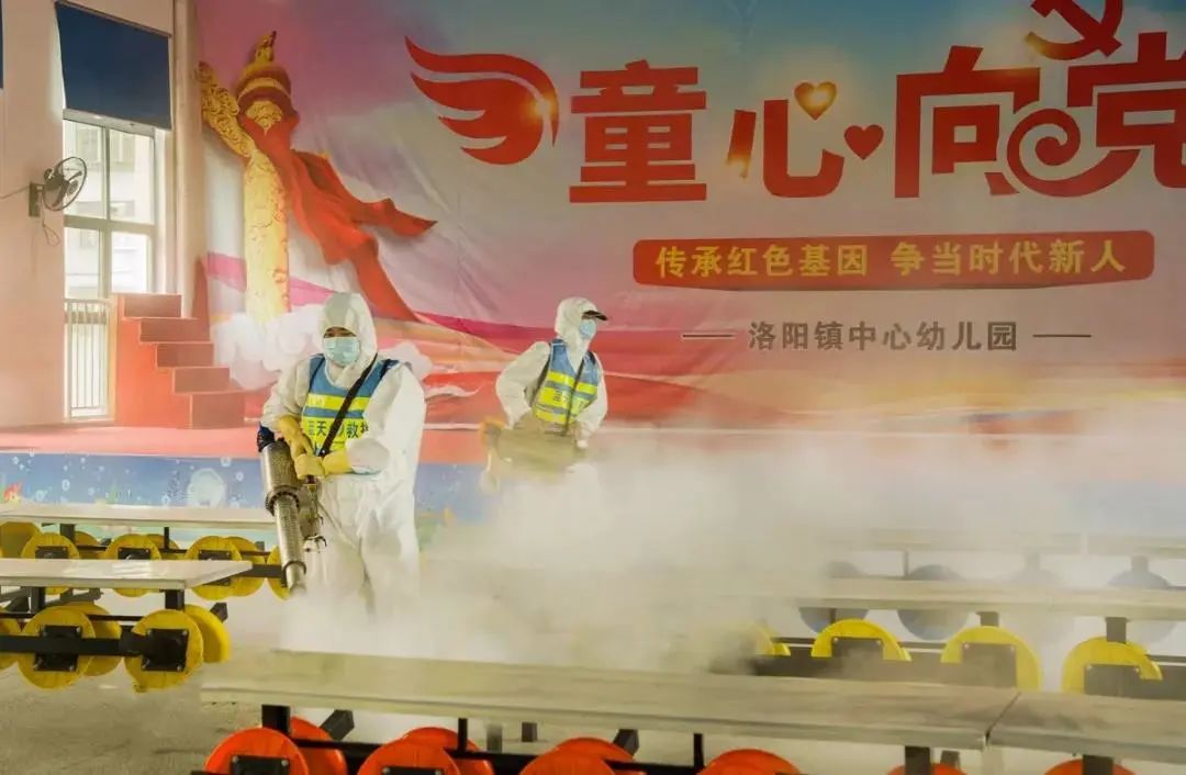 戴上口罩、穿好防护服,背上消毒液,手持脉冲弥雾机……8月27日,在洛阳镇高级小学蓝天救援队正在有序对校园进行全方位、全覆盖、无死角消毒杀菌。