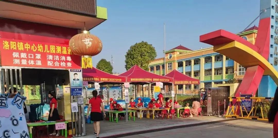 在洛阳镇中心幼儿园测温通道,完成扫码、测温、登记等手续,走进校园看到老师们正在忙碌着清扫班内外的每一个角落。