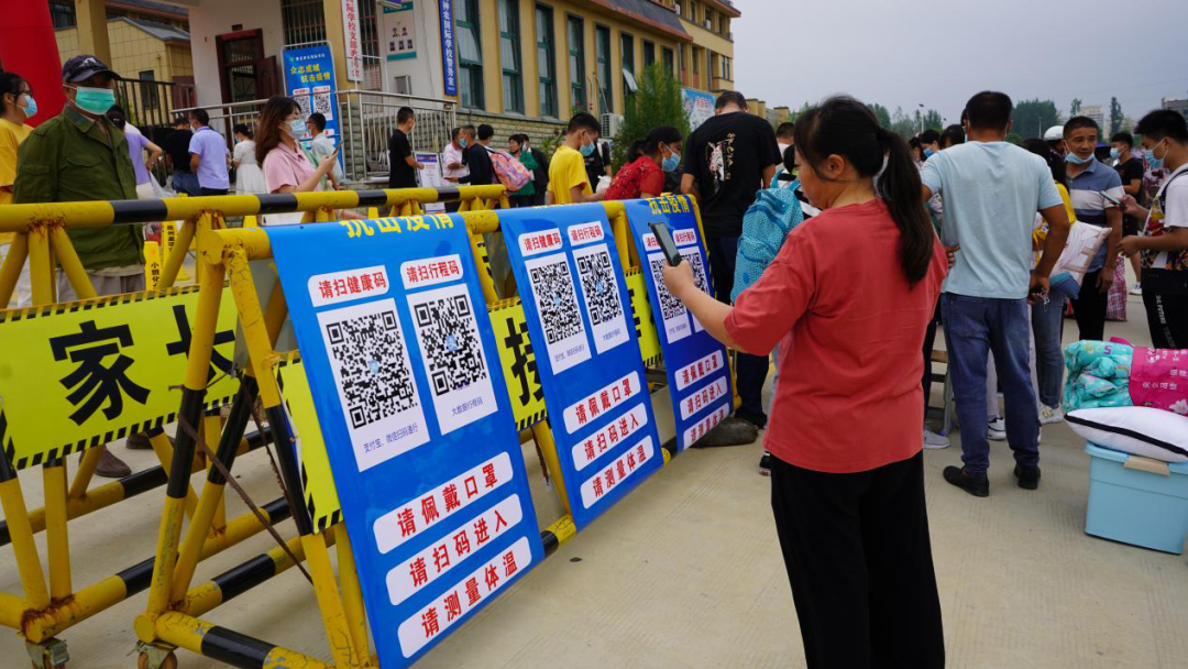 学生们有序扫码、测体温、消毒