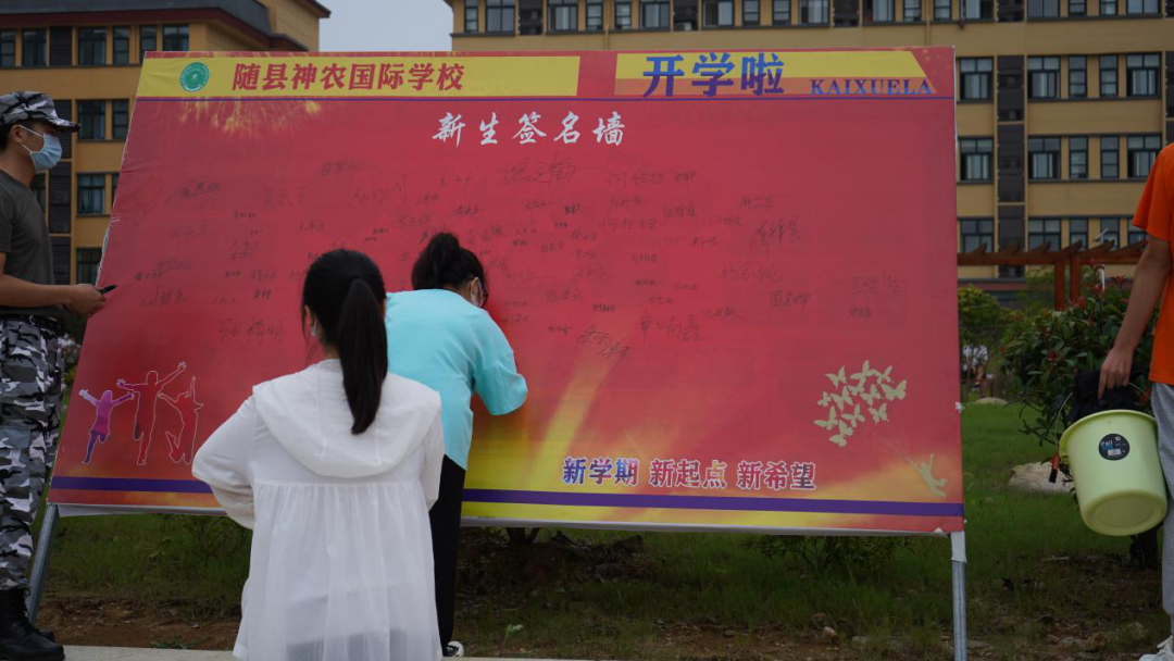 入学新生在签名墙上签下自己的名字