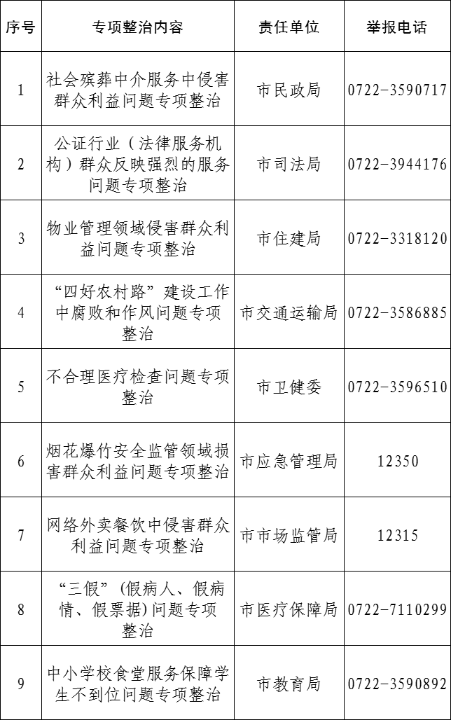 根据省、市统一部署,自即日起市纪委监委会同市直有关单位对群众身边腐败和作风问题开展专项整治,着力解决一批群众最关心、最直接、最现实的利益问题。为方便群众参与监督和反映问题,现将专项整治受理举报和反映问题的方式公告如下: