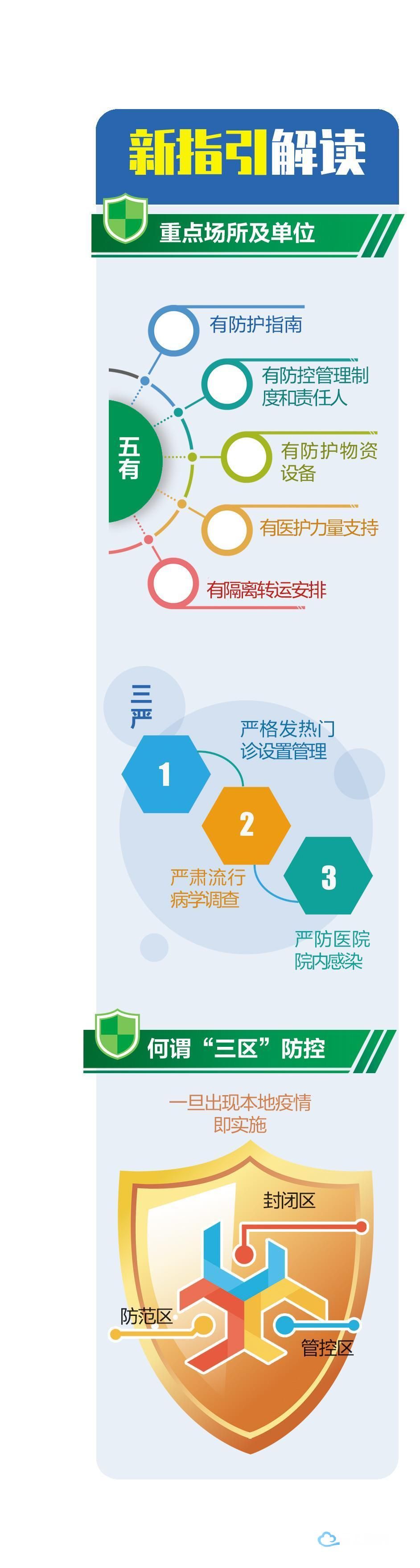 依照新指引,我省将落实四方责任,重点场所及单位严格做好“五有三严”工作,即有防护指南、有防控管理制度和责任人、有防护物资设备、有医护力量支持、有隔离转运安排,严格发热门诊设置管理、严肃流行病学调查、严防医院院内感染;减少人员流动,非必要不出境,非必要不到中高风险区所在地;严控聚集性活动,原则上不举办规模聚集性活动,确需举办的,需按程序报批;出入各类公共场所必须佩戴口罩,文化休闲娱乐场所要实行限流、验码、测温,室内要常通风;旅游景点要实行限流、预约、错峰、验码,不邀请、不组织中高风险区所在地人员来鄂旅游;商场、集贸市场等要定时消毒、通风。