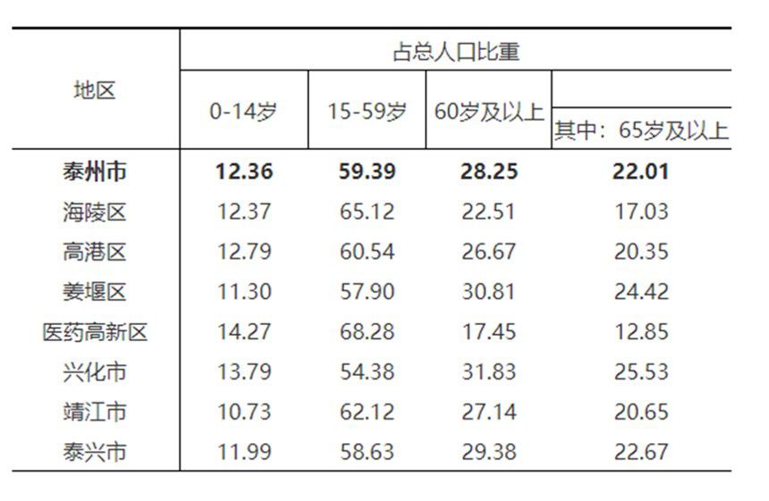 同处苏中地区的泰州65岁及以上人口占比也达到了22.01%;与2010年相比,其60岁及以上人口的比重上升7.43个百分点,65岁及以上人口比重上升7.78个百分点。分区域来看,泰州除了医药高新区65岁及以上人口比重低于14%外,其余的区、县级市都高于14%,其中兴化市达到了25.53%,姜堰区也达到了24.42%。