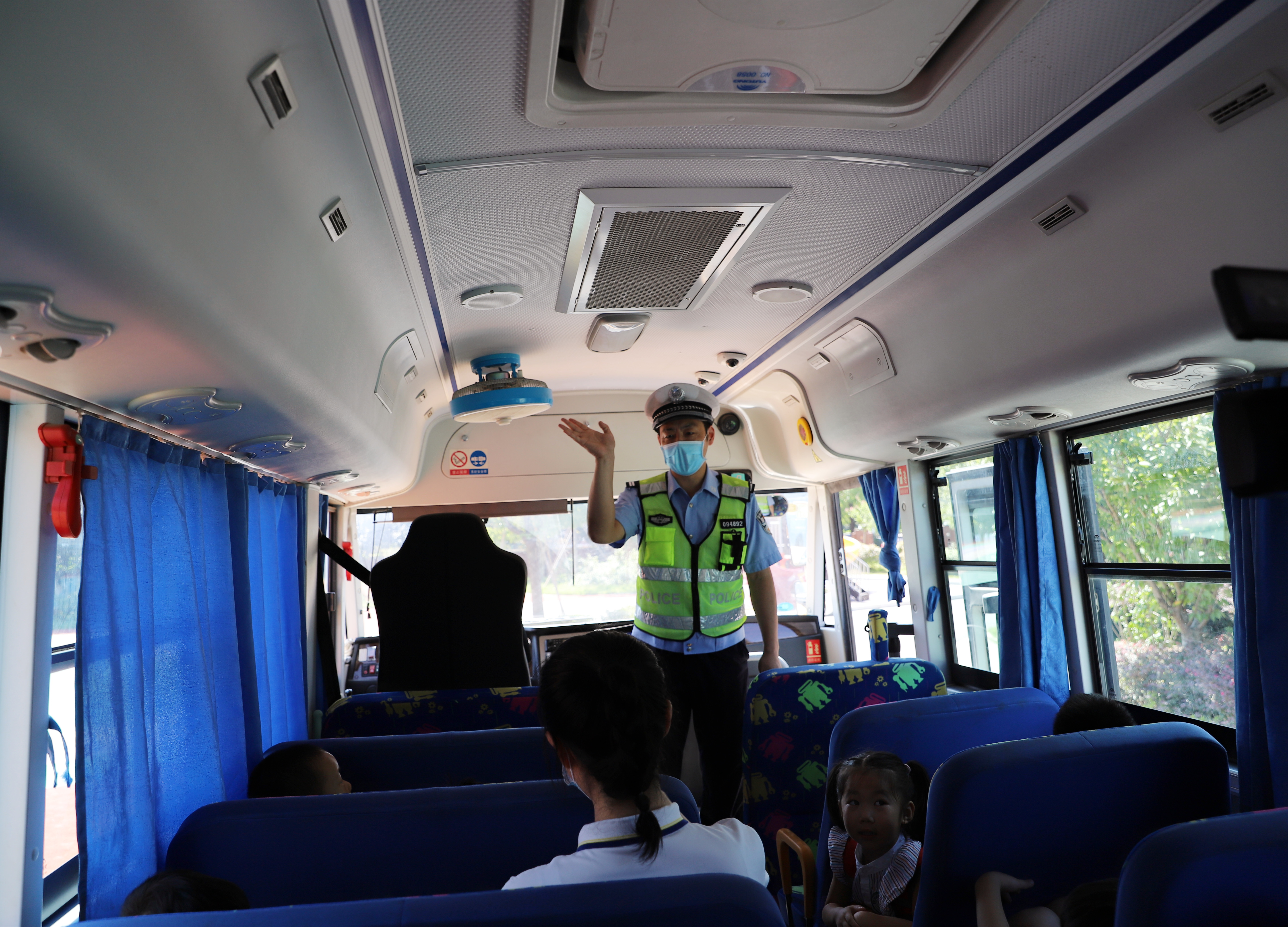 在模拟乘坐校车现场,小朋友在车外依次排队等候,然后老师将孩子们一个一个领进校车里有序坐好。交警叔叔在车上给孩子们讲解了乘坐校车需注意的交通安全问题。校车司机告诉主持人,自己开校车以来,从未出现过交通违法行为,也没有发生过交通安全问题。他还详细介绍了日常接送孩子的情况、校车内的安全设施情况、行驶途中注意的安全事项等情况。
