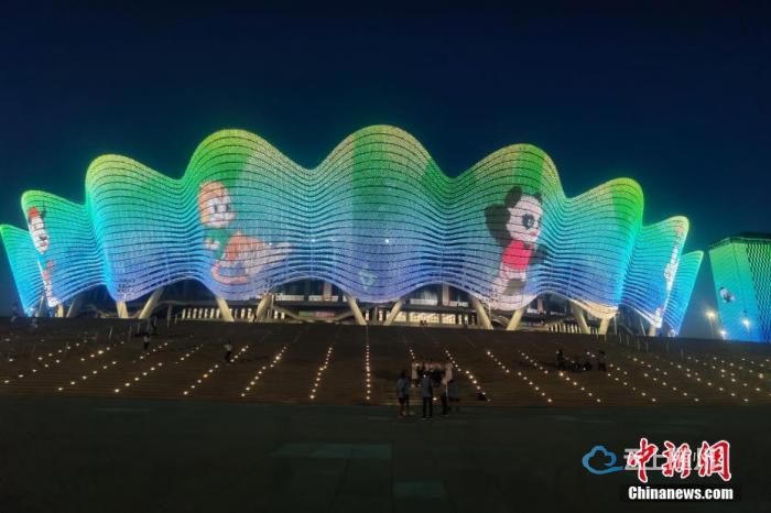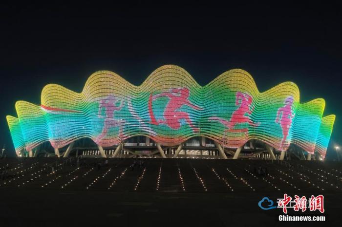 9月13日,西安奥体中心场馆亮灯开启“全运时刻”。中华人民共和国第十四届运动会将于9月15日在西安开幕。 中新社记者 杨艳敏 摄