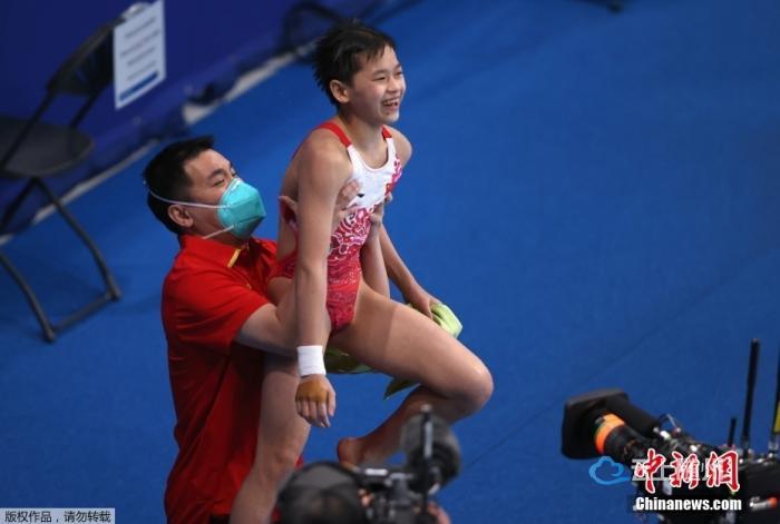 资料图:中国代表团年龄最小的奥运冠军诞生,全红婵以领先95分的总成绩拿到东京奥运会10米跳台金牌,赛后教练把她高高举起。