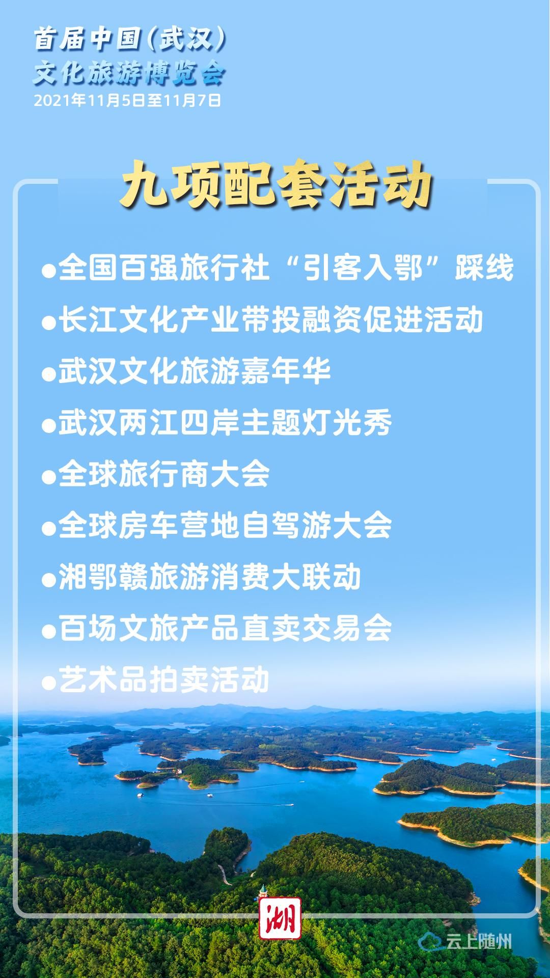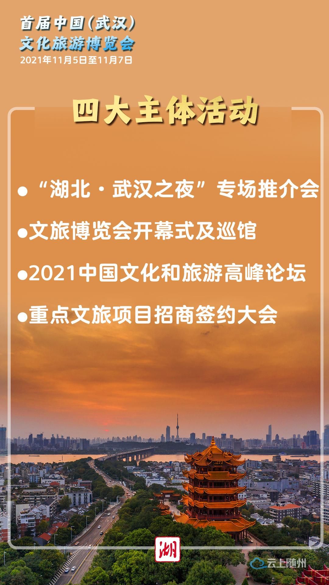 发布会介绍,首届文旅博览会将举办“湖北·武汉之夜”专场推介会、开幕式及巡馆、2021中国文化和旅游高峰论坛、重点文旅项目招商签约大会等4大主体活动。同时,举办全国百强旅行社“引客入鄂”踩线、长江文化产业带投融资促进活动、武汉文化旅游嘉年华、武汉两江四岸主题灯光秀、全球旅行商大会、全球房车营地自驾游大会、湘鄂赣旅游消费大联动、百场文旅产品直卖交易会、艺术品拍卖等9项配套活动。