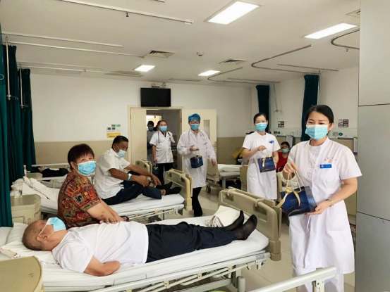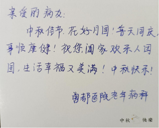 有些当天来曾都医院老年病科就诊的患者,刚刚办完入院手续,就收到了我们送上的中秋祝福,患者说“刚来就收到了礼物,怪不好意思的!谢谢你们!这个中秋节真的很难忘!”