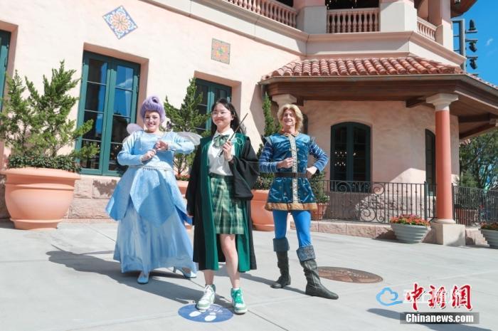 9月21日,北京环球度假区,游客与“仙女教母”和“白马王子”合影。 中新社记者 贾天勇 摄