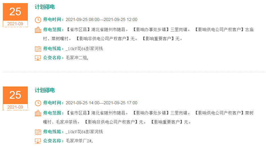 停电范围:【省市区县】湖北省随州市随县。【影响办事处乡镇】三里岗镇。【影响供电公司产权客户】古庙村、栗树嘴村。【影响非供电公司产权客户】无。【影响重要客户】无。