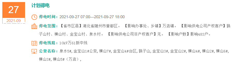 停电范围:【省市区县】湖北省随州市曾都区。【影响办事处、乡镇】万店镇。【影响供电公司产权客户】鹞子山村、横山村、金宝山村、泉水村。【影响供电公司非产权客户】无。【影响户数】影响483户。