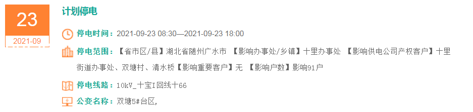 停电范围:【省市区/县】湖北省随州广水市 【影响办事处/乡镇】十里办事处 【影响供电公司产权客户】十里街道办事处、双塘村、清水桥【影响重要客户】无 【影响户数】影响91户