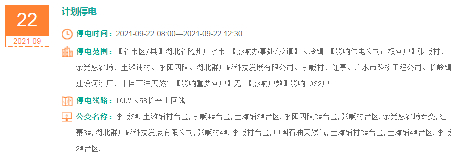 停电范围:【省市区/县】湖北省随州广水市 【影响办事处/乡镇】长岭镇 【影响供电公司产权客户】张畈村、余光恕农场、土滩铺村、永阳四队、湖北群广威科技发展有限公司、李畈村、红寨、广水市路桥工程公司、长岭镇建设河沙厂、中国石油天然气【影响重要客户】无 【影响户数】影响1032户