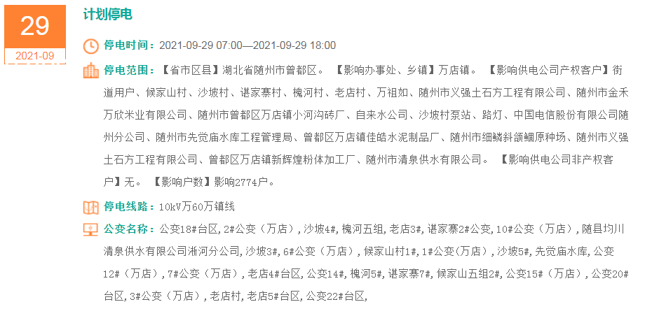停电范围:【省市区县】湖北省随州市曾都区。【影响办事处、乡镇】万店镇。【影响供电公司产权客户】街道用户、候家山村、沙坡村、谌家寨村、槐河村、老店村、万祖如、随州市义强土石方工程有限公司、随州市金禾万欣米业有限公司、随州市曾都区万店镇小河沟砖厂、自来水公司、沙坡村泵站、路灯、中国电信股份有限公司随州分公司、随州市先觉庙水库工程管理局、曾都区万店镇佳皓水泥制品厂、随州市细鳞斜颌鲴原种场、随州市义强土石方工程有限公司、曾都区万店镇新辉煌粉体加工厂、随州市清泉供水有限公司。【影响供电公司非产权客户】无。【影响户数】影响2774户。