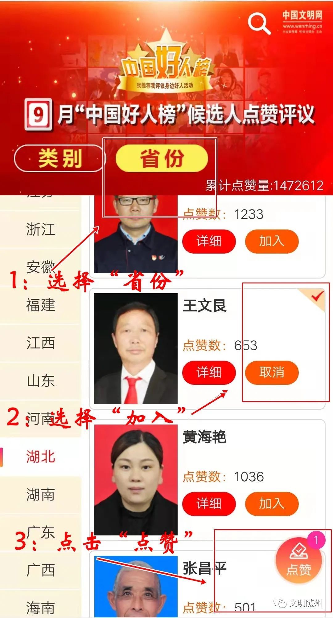 1:点击“省份”选项后,选择“湖北”,找到被点赞人“王文艮”,“加入”到点赞库;