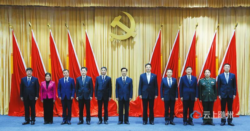 图为新当选的中国共产党随州市第五届委员会常务委员会委员钱远坤(中)、克克(右五)、林常伦(左五)、杜文清(右四)、甘国栋(左四)、吴丕华(右三)、张卫(左三)、张爱华(右二)、舒敏(左二)、陈兴旺(右一)、黄继军(左一)。(随州日报全媒记者孙洪涛摄)
