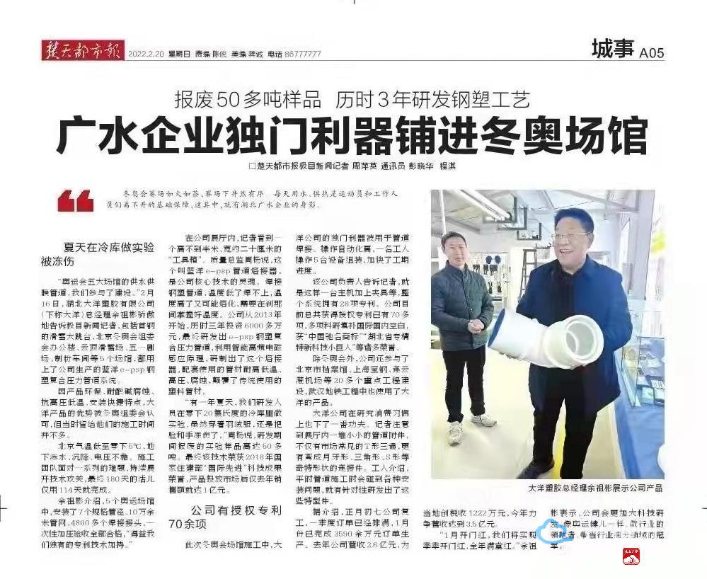2月14日,广水市融媒体中心发布新闻《优秀!广水这家企业硬核技术闪耀北京冬奥会》,在全网率先报道了湖北大洋塑胶有限公司攻克技术难关、为冬奥会场馆提供服务的相关事宜,引起了社会各界和新闻媒体的广泛关注。