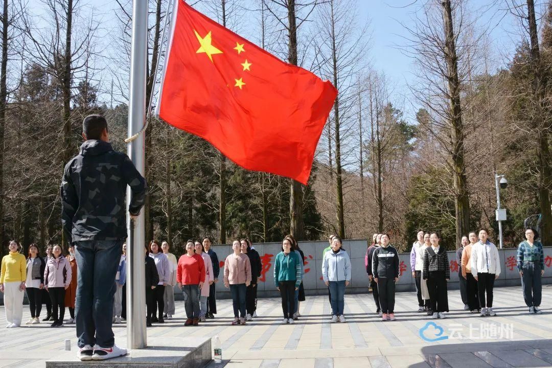伴随着庄严雄壮的《义勇军进行曲》,鲜艳的五星红旗在大洪山革命陈列馆上空冉冉升起。女干警们整齐列队,面向国旗行注目礼,共祝伟大祖国山河锦绣、国泰民安。