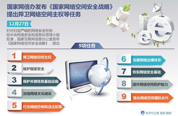 图表:国家网信办发布《国家网络空间安全战略》 提出捍卫网络空间主权等任务 新华社记者 高微编制