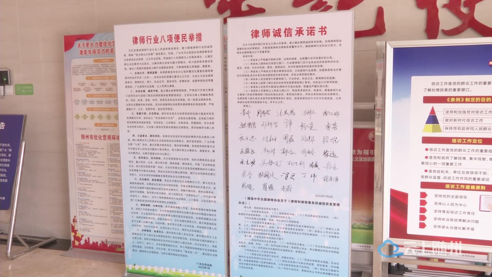自今年6月份以来,广水市司法局加快推进步伐,积极探索律师行业从业人员的诚信体系建设,建立完善全体律师执业人员《律师诚信电子档案》,公示律师行业人员签订的诚信承诺书,还组织律师事务所推出“法治体检、开展法治宣传、化解矛盾纠纷”等8项便民措施,有效提升了法律服务质效。