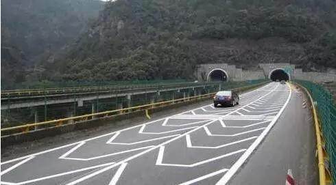 在隧道外200米一直到隧道内100米的区域,会画上这种线。驾驶人看到这种线会有一种空间压缩的感觉,驾驶人在进入隧道前自然就会下意识的减速,起到一定的安全防范辅助作用。