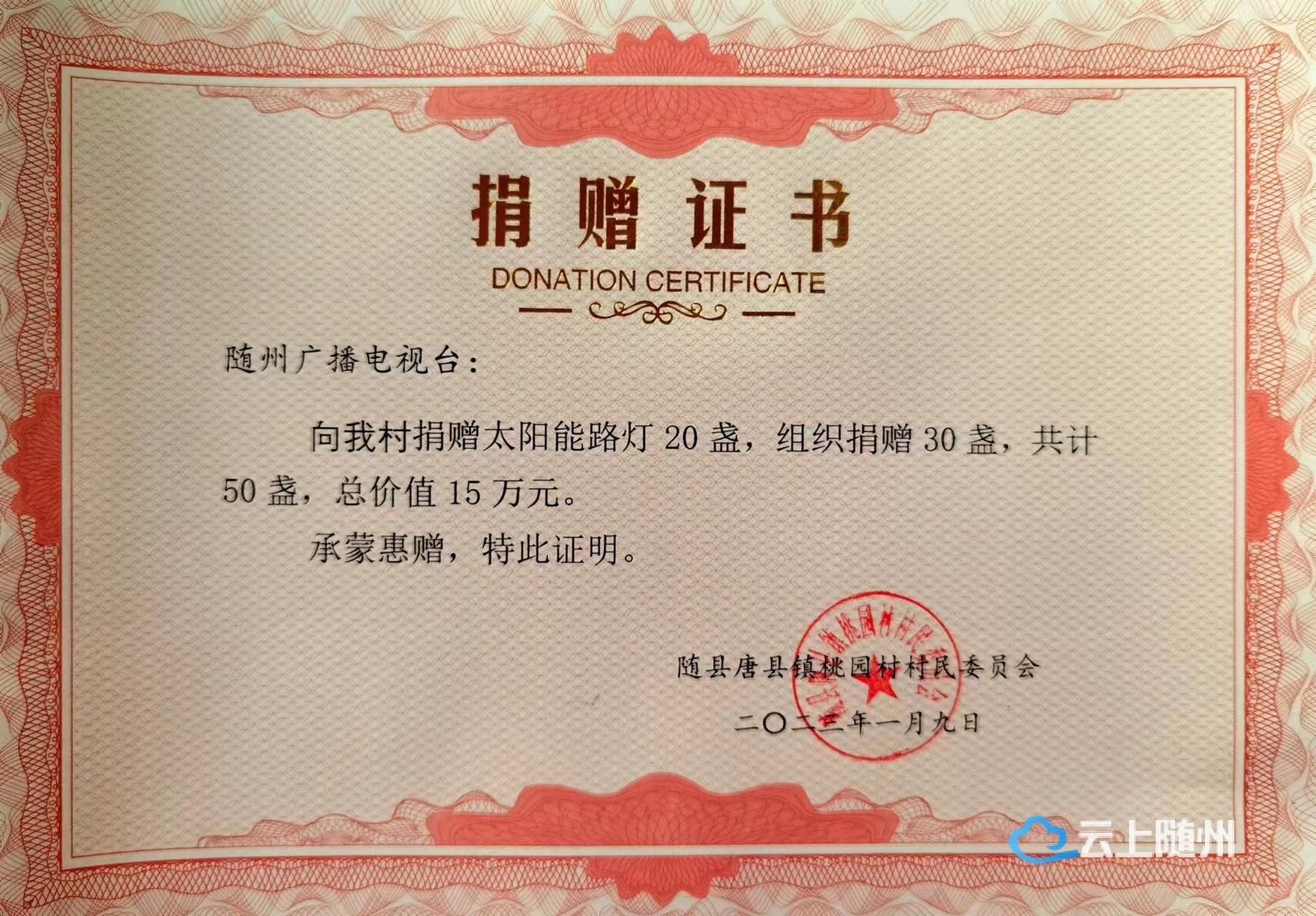 春节前夕,随州广播电视台主要领导来到唐县镇桃园村,向该村捐赠了50盏太阳能路灯,总价值15万元。