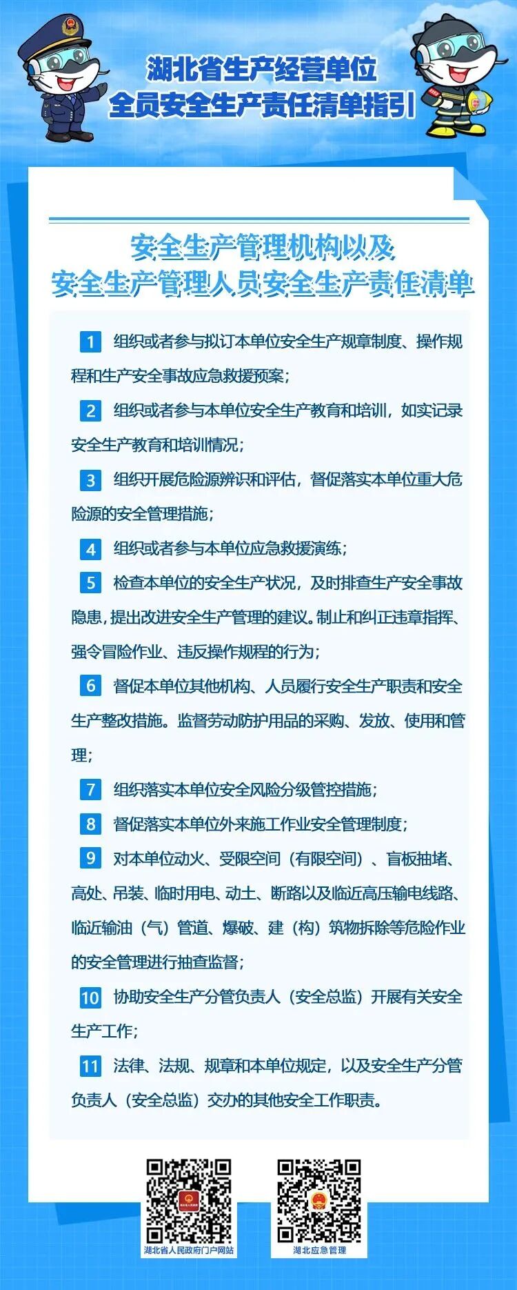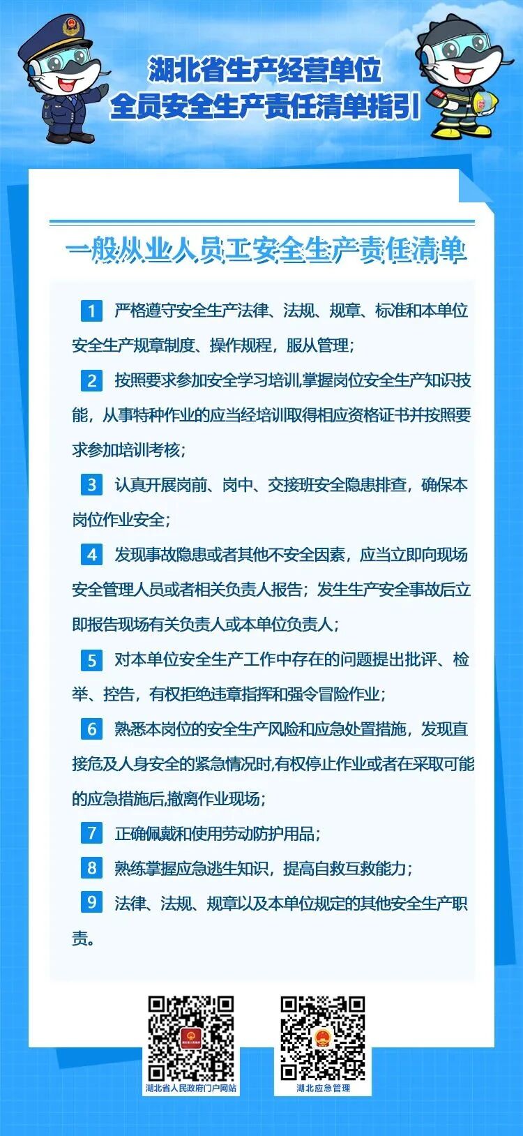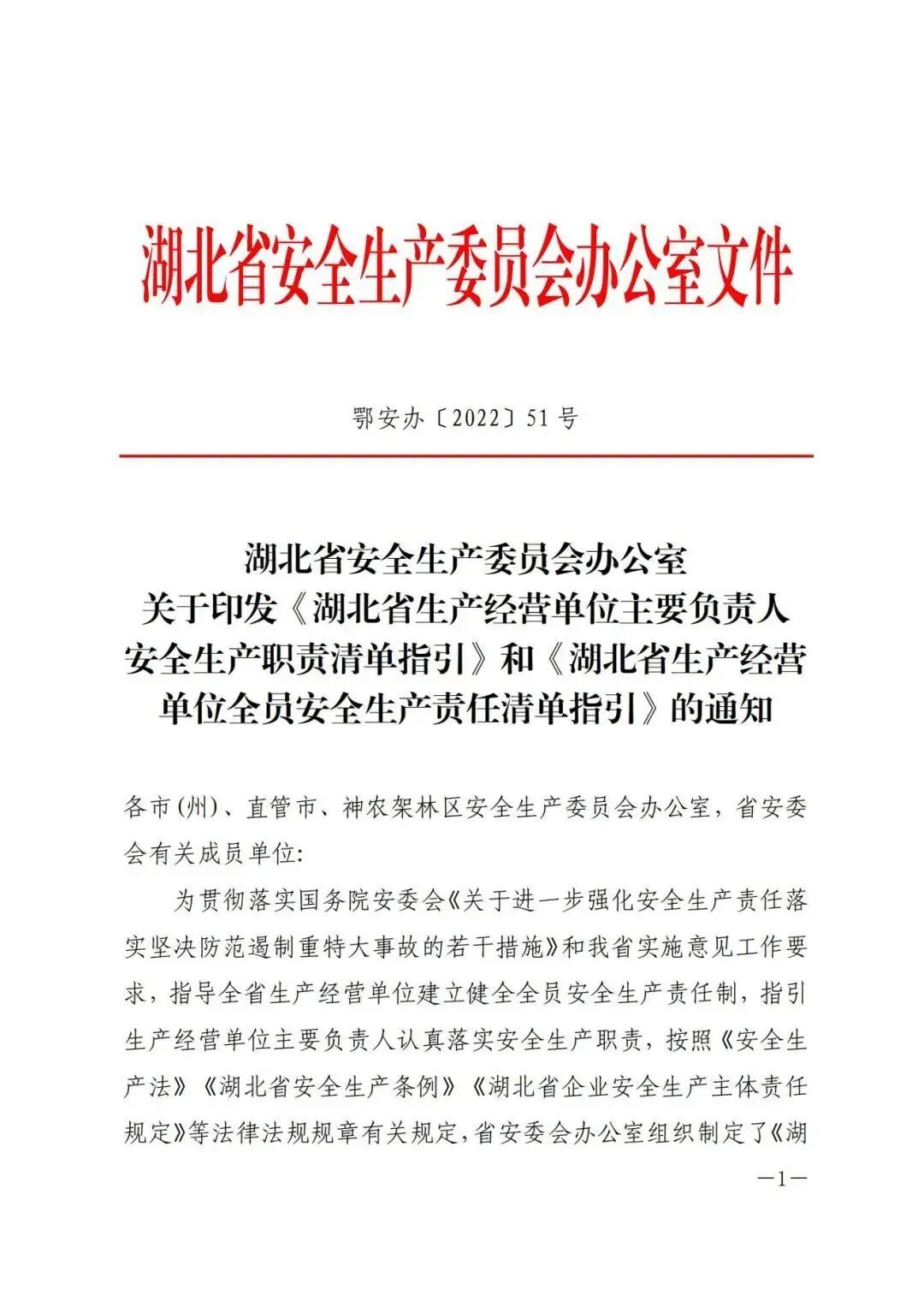 2022年10月21日,湖北省安委办印发《湖北省生产经营单位主要负责人安全生产职责清单指引》和《湖北省生产经营单位全员安全生产责任清单指引》,这是落实企业主体责任,全面加强安全生产监管的具体举措,对推动全省安全生产形势稳定好转,具有重要意义。