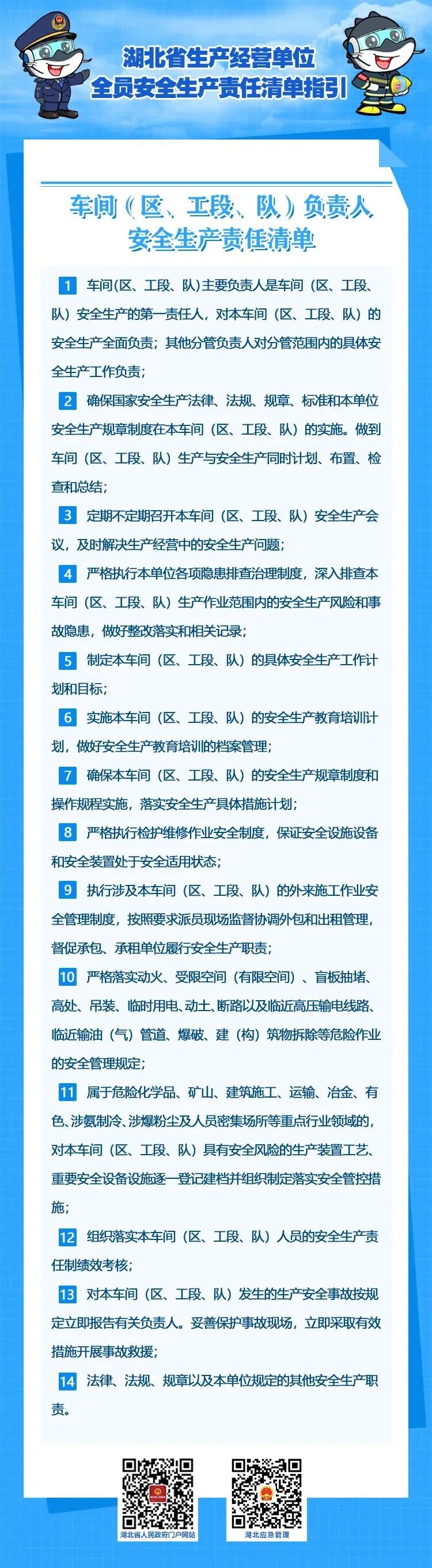 《湖北省生产经营单位主要负责人安全生产职责清单指引》,依法依规明确了企业主要负责人8个方面的职责,并细化延展为18项具体职责。《湖北省生产经营单位全员安全生产责任清单指引》,分别明确了主要负责人、安全生产分管负责人(安全总监)、其他负责人、安全生产管理机构以及安全生产管理人员、其他职能部门负责人、车间(区、工段、队)负责人、生产班组长、一般从业人员等8个层级(岗位)人员的安全生产责任清单,细化延展为72项具体职责,实现了对象全覆盖、职责具体化。同时,“两个清单”均明确了不履行职责的法律后果,明确了从内部惩戒到行政处罚直至追究刑事责任、实施联合惩戒等追责措施。
