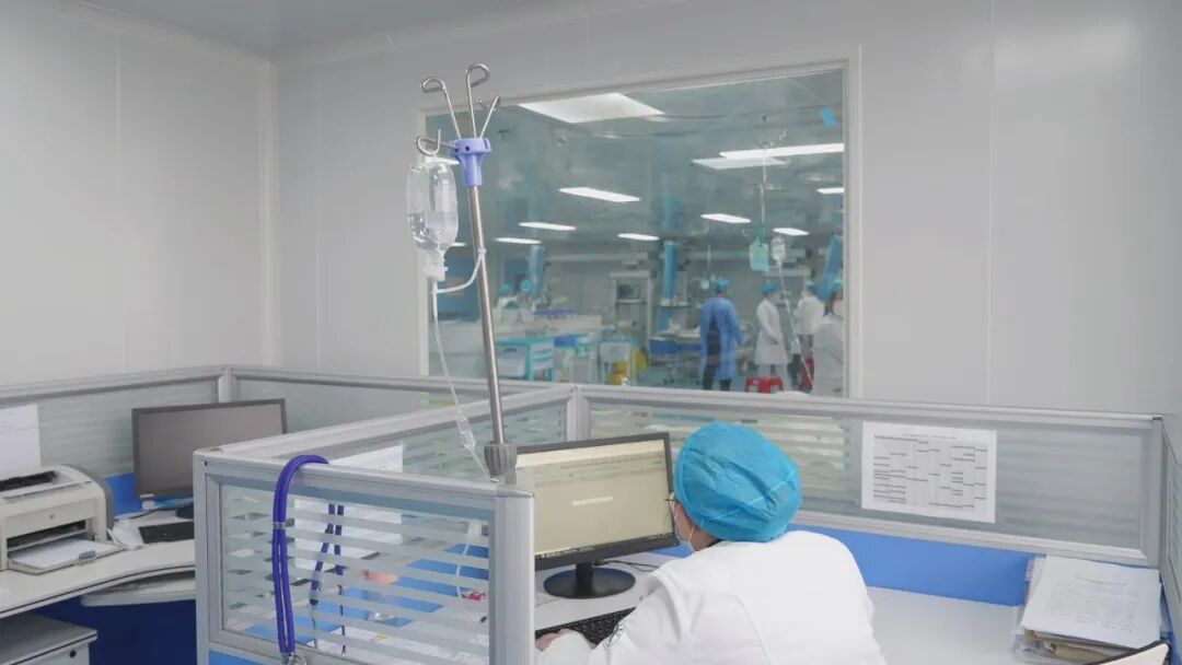 面临第一波感染高峰的冲击,在随州高新区医院重症医学科,争分夺秒抢救患者的场景每一天循环出现。医护人员穿梭在患者中,上呼吸机、置管、输液、换药、核对患者信息;诊室内的医生不停地敲击键盘,为患者录入病情、开具处方;操作间的护士细之又细,像对待自己家人一样照顾着每一名患者。他们挂着吊瓶依然坚守在自己的岗位,他们默契而又一刻不停地维系着ICU这个精密复杂的机器正常运转。