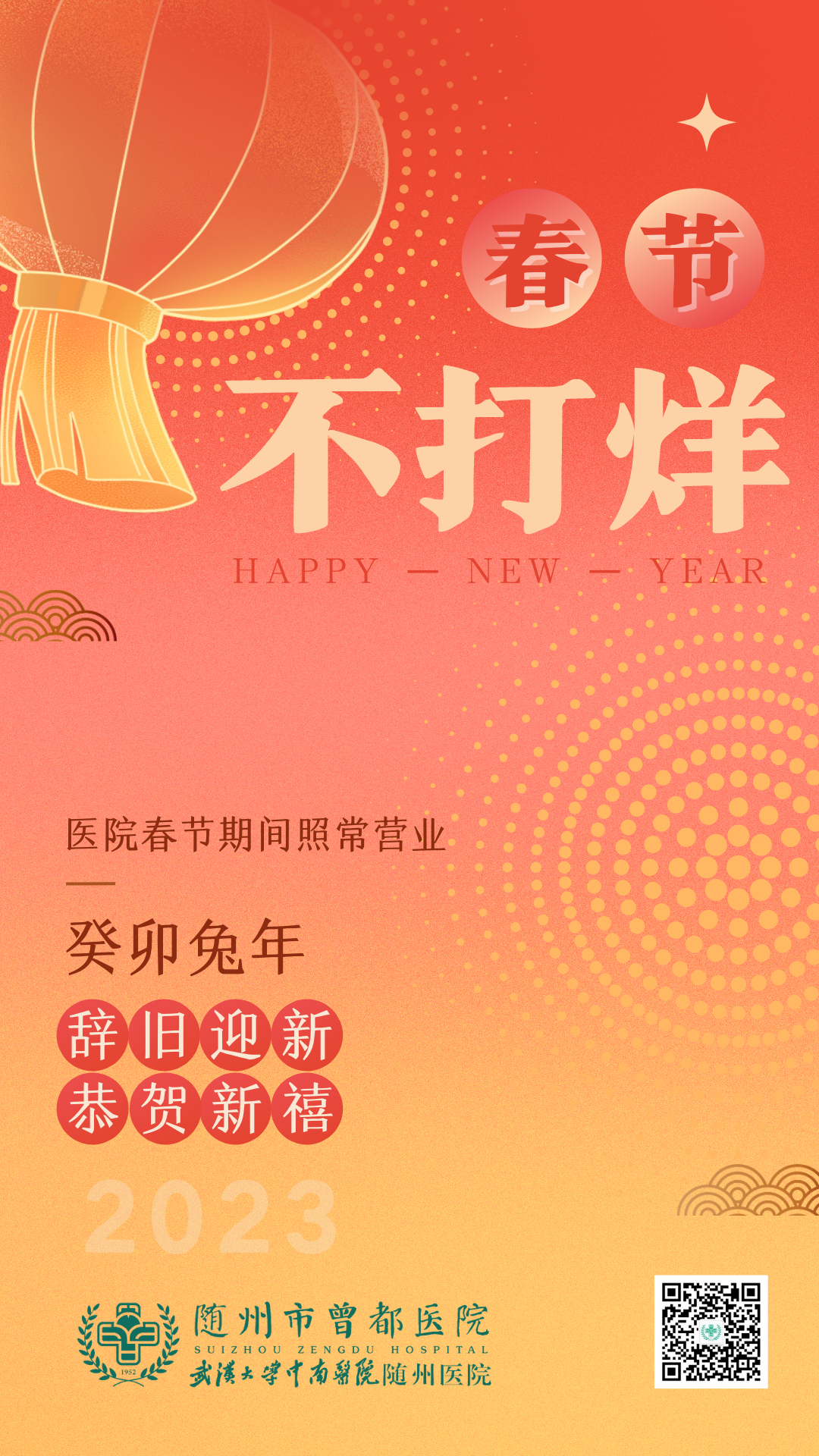 天地祥和,万象更新;历添新岁,春满曾医。壬寅已成往昔,癸卯即将来临,在这辞旧迎新、普天同庆的美好时刻,我们谨代表随州市曾都医院党政领导班子,向全院干部职工、离退休老同志、各兄弟单位、广大患者朋友和社会各界朋友致以美好的祝福!向关心支持我院发展的各级领导和社会各界朋友致以衷心的感谢!向一直坚守在救死扶伤第一线的同事们致以诚挚的问候!
