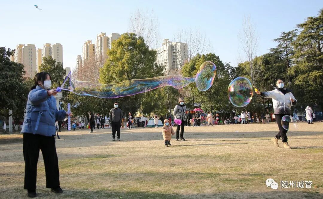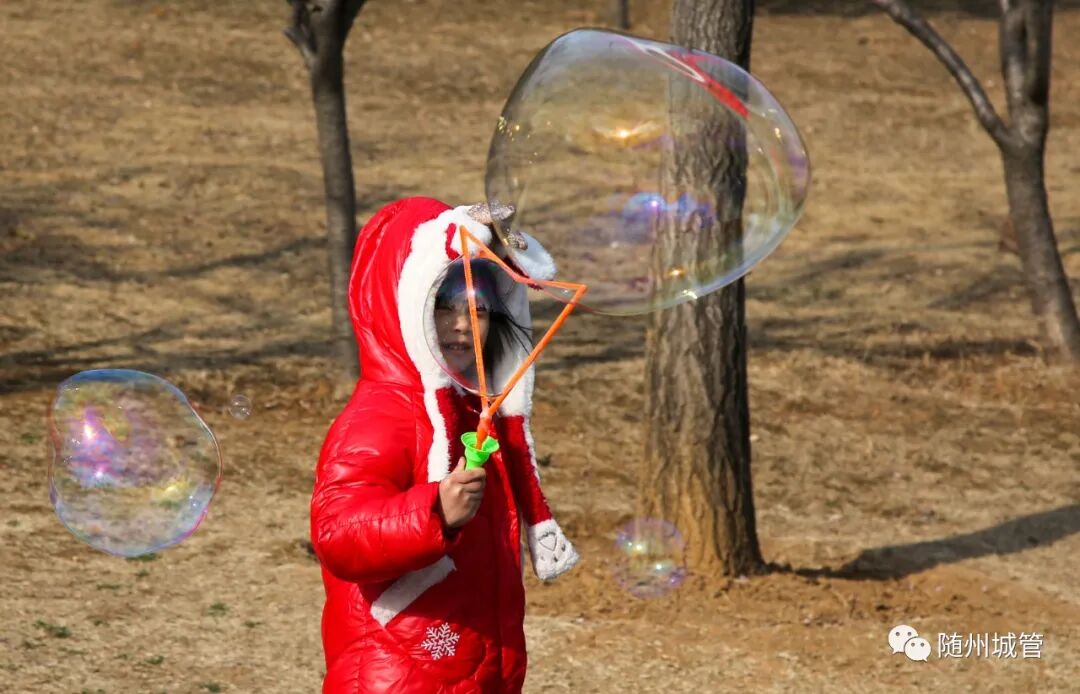 在和煦的阳光下,带着欢乐的风筝腾空而起;在持续的挥动中,一串串七彩斑斓的气泡美丽绽放。人们悠闲地漫步,孩子们快乐地嬉闹奔跑,公园成为人们释放炽烈情感的海洋。