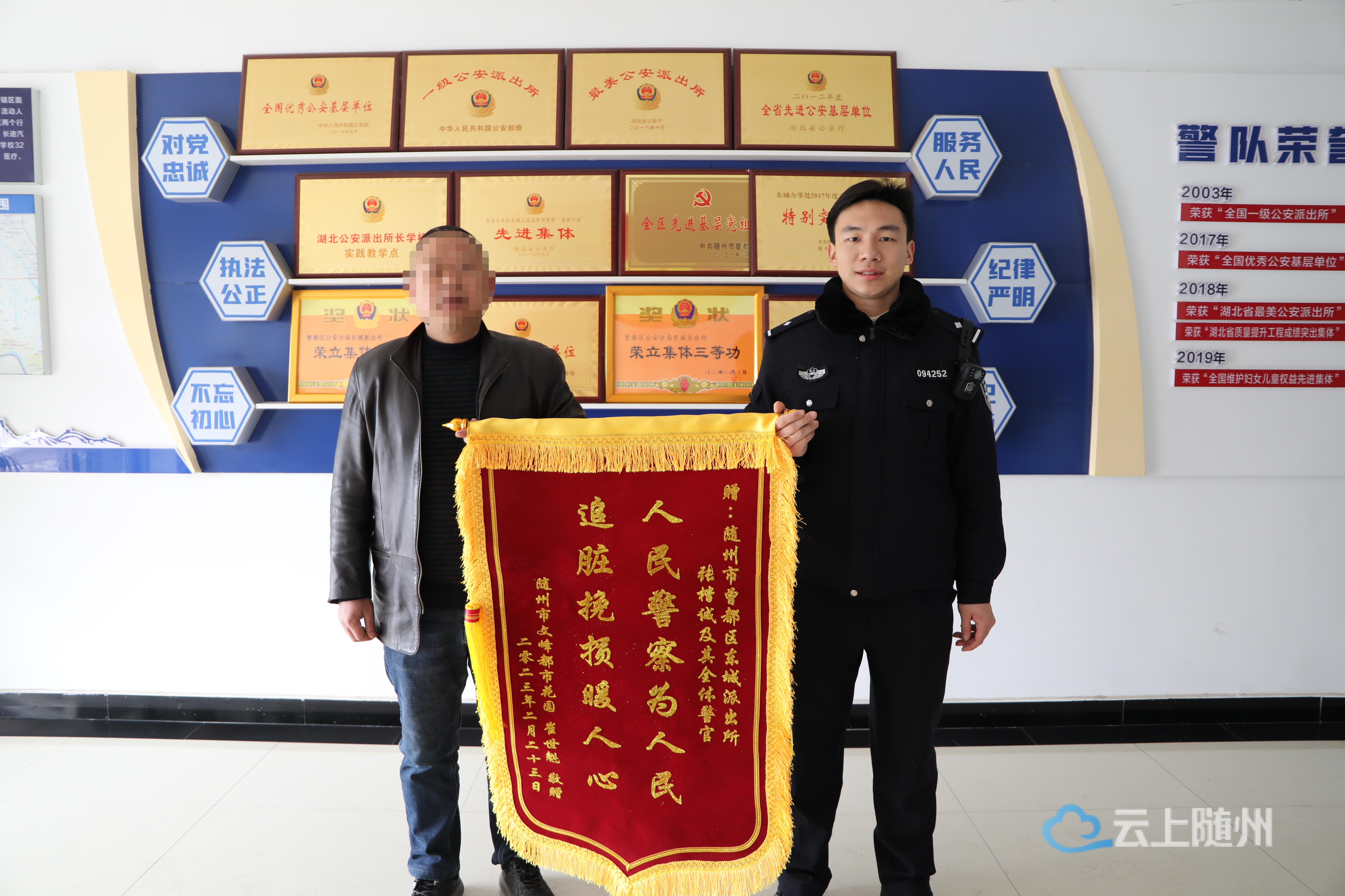 “人民警察为人民,追赃挽损暖民心。”2月23日,崔先生拿着锦旗送到曾都区分局东城派出所民警手中,对其为崔先生挽回5万元被骗资金表示诚挚感谢。