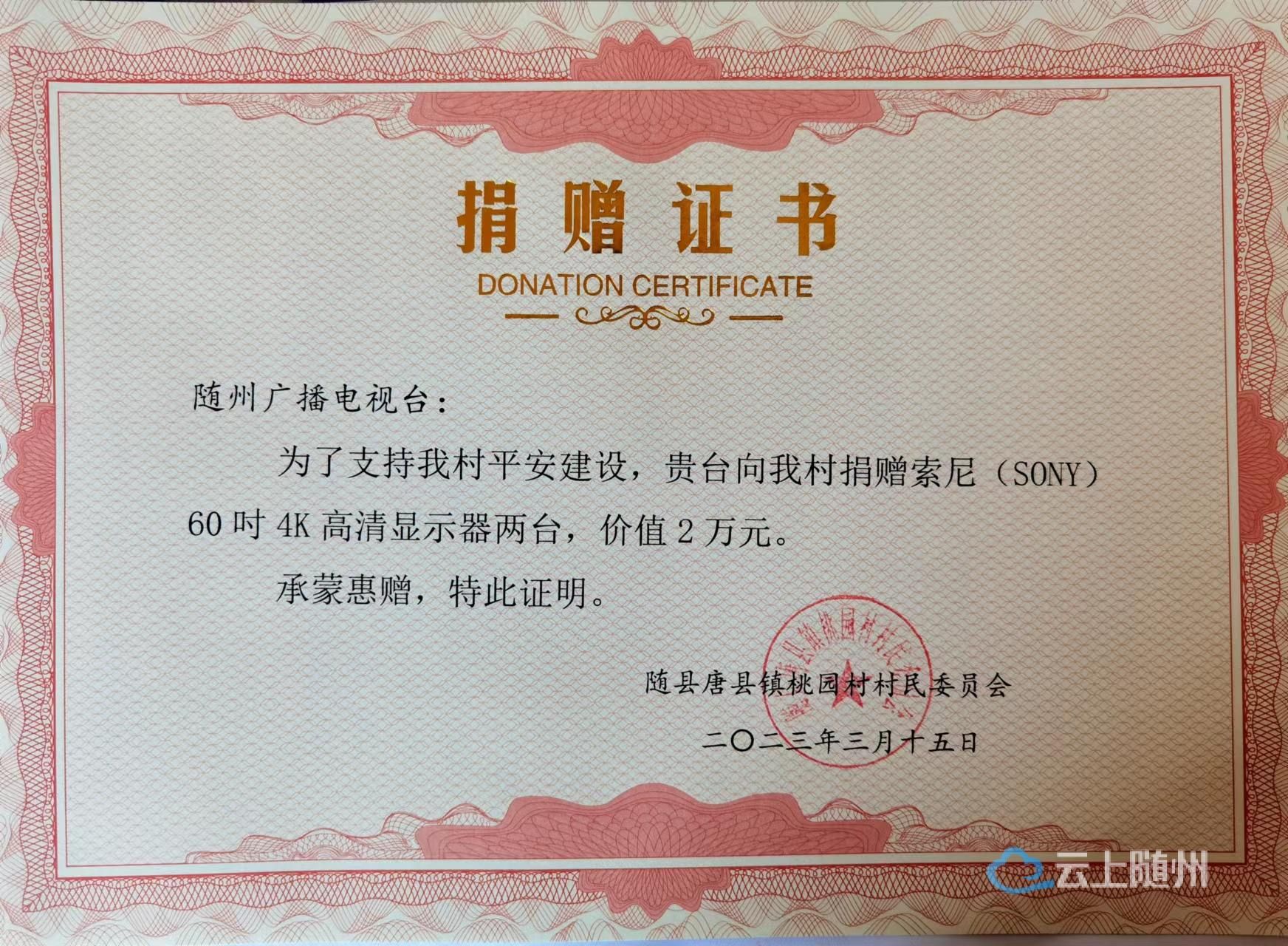 随后,随州广播电视台向该村赠送了两台价值2万元的索尼60吋4K高清显示器,以弥补和完善该村视频监控设备的不足。