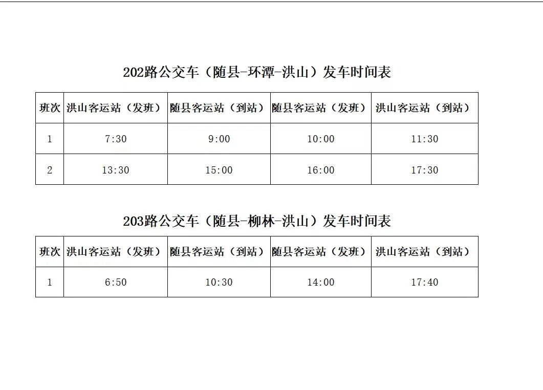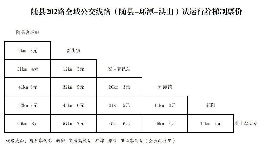 据随县城乡融合建设发展有限公司总经理郭远洋介绍,两条线路起点都从洪山镇客运站出发,终点到达随县客运站,当天往返。其中202线路全长66公里,全程票价8元,途经新街镇、安居高铁站、澴潭镇、郧阳;203线路全长122公里,全程票价14元,途经新街镇、安居高铁站、安居卫生院、均川镇、柳林镇、金桥、刘店、三里岗镇、土门、长岗镇、新阳。