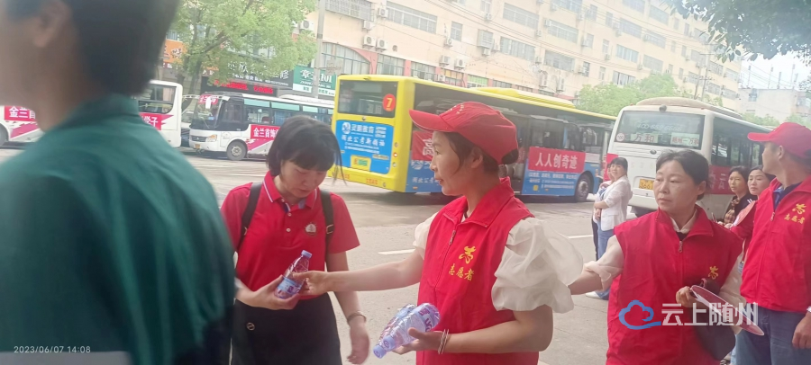 6月7日早上7点,在随州市一中,市二中、市实验高中、曾都一中四个高考点校门外,志愿者们搭起了遮阳棚、拉起了横幅、摆好了桌椅、并统一身着志愿者服装,摆放免费饮用水、文教用品,防暑用品、医疗救援等物资,迎接考生和家长们的到来。伴随着一批批的考生和家长陆续抵达考场,志愿者们开始忙碌起来,为广大考生和家长免费提供矿泉水、并送上一句“祝你考出好成绩”祝福。在考点外,志愿者们进行文明劝导,维护现场秩序,提醒送考的家长不要大声喧哗,为参加高考的考生营造一个安静的考试环境;与家长沟通,帮助他们舒缓紧张的情绪,讲解在考试期间可能出现的紧急情况以及解决办法,提高家长应对高考期间突发状况的意识和能力。“孩子在里面考试,我们在外面等的也急,希望我家孩子这次能考出好成绩,谢谢志愿者们热情周到的服务”志愿者们的贴心服务,受到考生家长的称赞。
