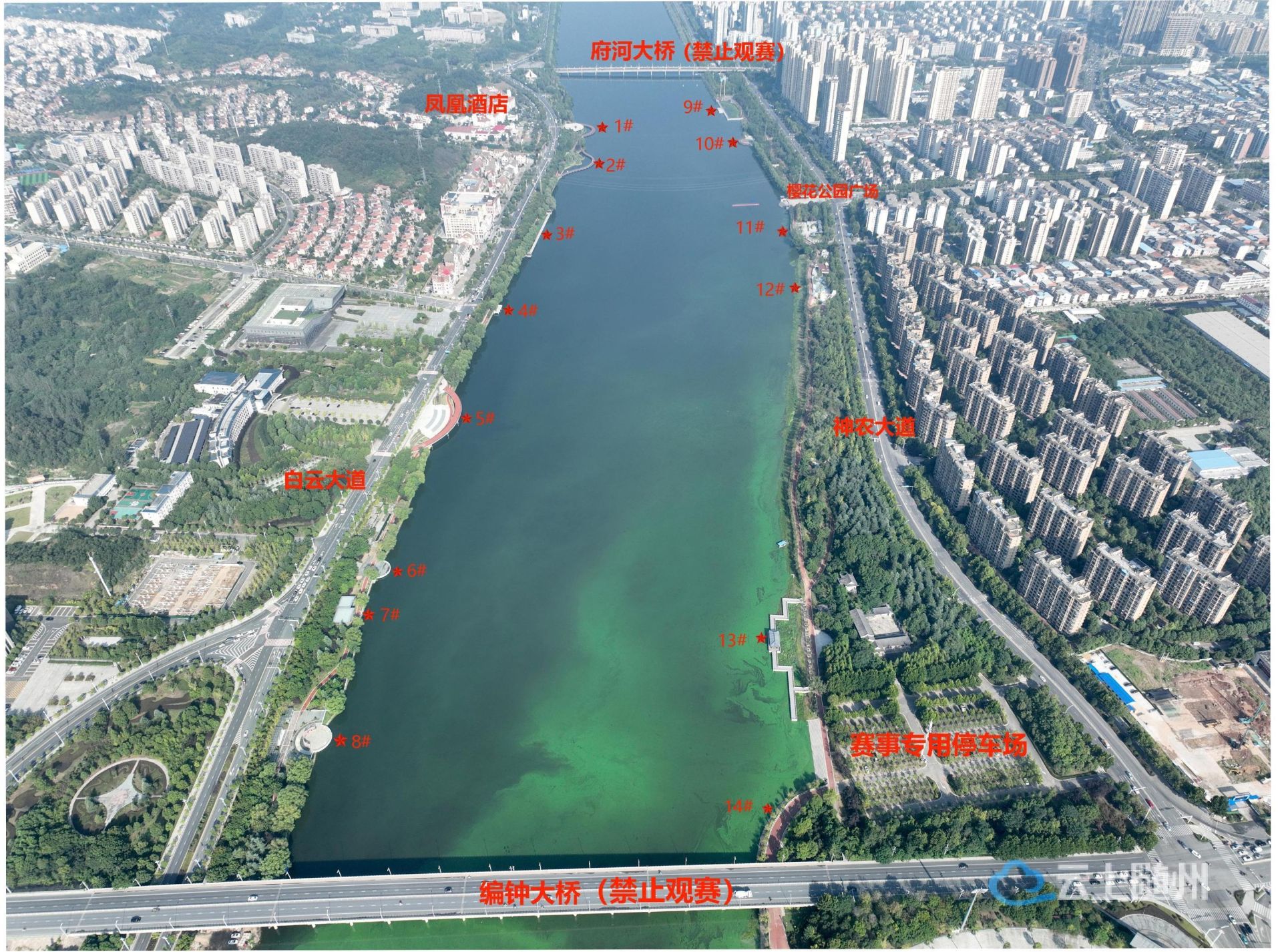 一是府河大桥、编钟大桥禁止观赛和停车逗留。请市民朋友服从现场工作人员的指挥,为了您的安全,请不要靠近无护栏的湖堤下坡位置,防止滑落水中,不要越过警戒线。