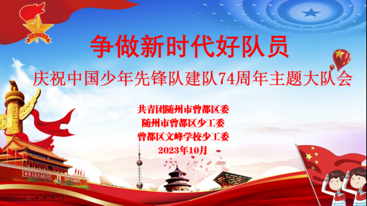 为庆祝中国少年先锋队建队74周年,引导广大少先队员听党话、感党恩、跟党走,争做新时代好队员,团区委、区少工委在曾都区文峰学校举办“争做新时代好队员”建队日主题大队会示范活动。