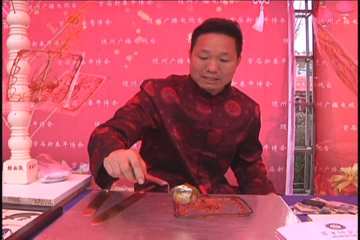 除了零食小吃之外,最吸引孩子的要数好吃又好看的糖画了。将特别熬制的糖像作画一样,一点点倒在一张铁皮板上,不一会儿,一个可爱的动物图形就出现了。做糖画的是我省民间艺术家张志刚,人称“糖面张”,此次他特意从武汉来到随州参加年博会,就是为了把糖画这个传统民俗带给这里的小朋友们。
