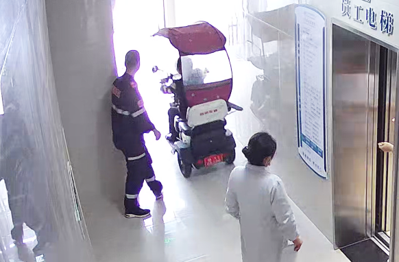 4月15日上午9时43分,随州市曾都医院消控中心值班人员在轮巡监控时,发现一名来院就诊的患者将电动车行驶至1号楼4楼,存在安全隐患。经观察发现,该电动车上有拐杖,判断患者应该是行动不便才将电动车开进就诊楼。消控中心值班人员立即呼叫消防巡查人员前去帮扶。