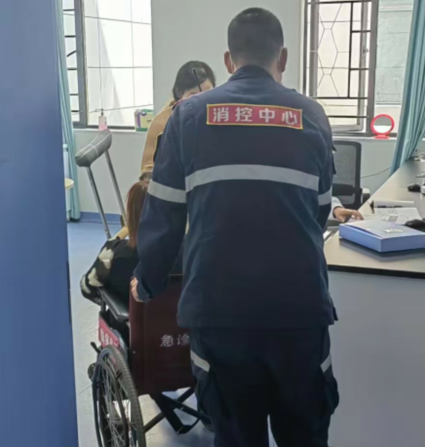 该片区消防巡查人员任泽龙接到命令后,迅速带上轮椅前往4楼,在候诊厅找到了该名患者,引导其将电动车停放在正确地点,并帮她扶上轮椅。“坐稳了,我们出发了,如果哪里不舒服,及时告诉我。”伴着关心的话语,任泽龙带着患者开始就诊旅程。