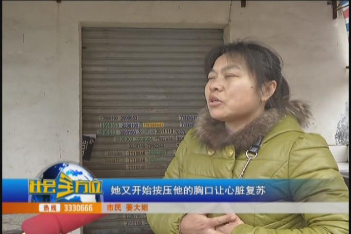【采访】市民 姜大姐:首先,掐他的人中,掐了两三分钟以后,她又开始按压他的胸口,让心脏复苏,做了两三分钟之后,看他还没有清醒,她就对着老人的嘴做人工呼吸,老人就出了一口气,慢慢地这个老人才恢复过来。