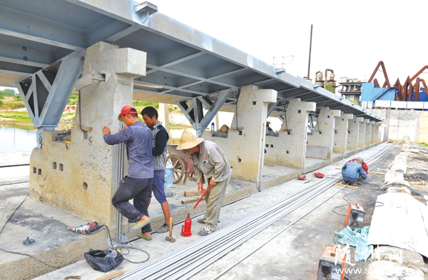 随州高新区高标准抓好淅河镇“一河两岸”配套工程建设。图为施工人员正安装翻板闸,确保年底蓄水。 来源:随州日报 记者 孙洪涛 通讯员 王 涛摄