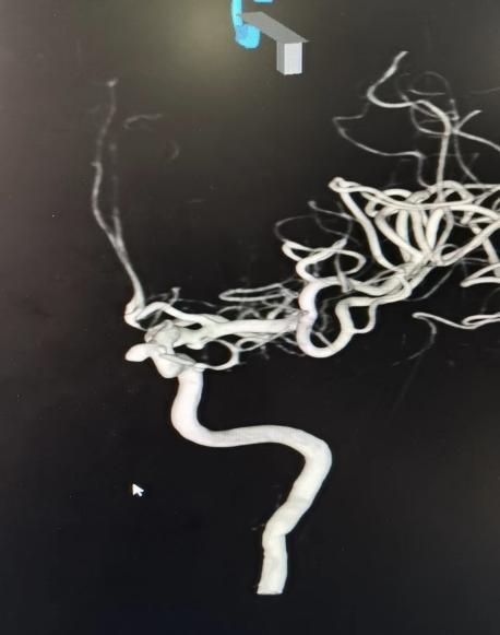 患者黄某某,因“头痛伴恶心1天”入院,行急诊颅脑CT显示:蛛网膜下腔出血。患者疾病突发且无外伤史,遂考虑动脉瘤破裂出血所致。入病房后,完善相关辅检,急诊行头颈部CTA检查后显示:颈内动脉C6段动脉瘤。