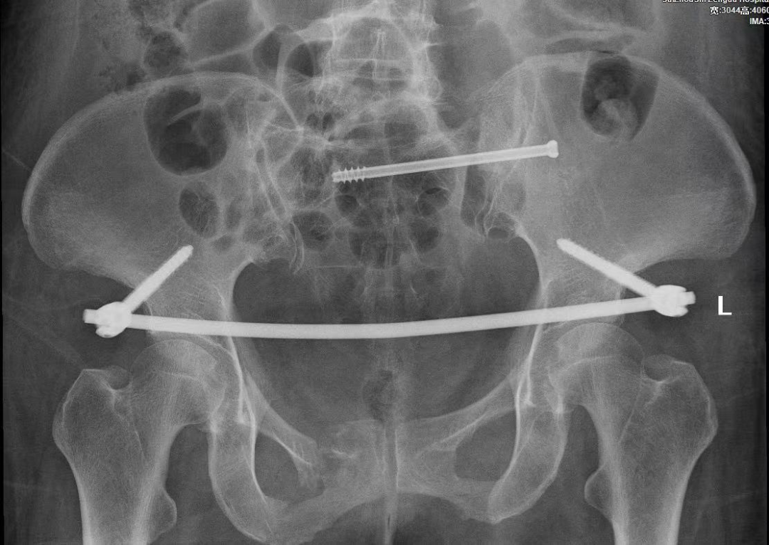 患者创伤严重,骨盆前后环垂直旋转不稳定,手术难度和风险都很高。关节、创伤、神经外科主任周强高度重视,考虑到传统的骨盆外固定,钉道口容易感染,体外装置对日常活动存在较大影响,固定稳定性较内固定存在差别,早期下床易出现骨折移位及易造成患者心理负担等缺点。经过医护团队多次讨论后,决定为其在全麻下行骨盆骨折InFix 固定+骶髂关节螺钉内固定,征询患者及其家属同意后,于6月1日在华中科技大学附属协和医院骨科郭晓东教授的指导下,顺利完成手术,目前患者恢复良好。