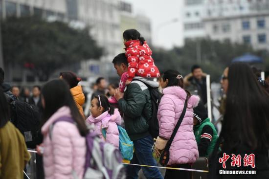 1月10日,2017年春运大幕进入3天倒计时,成都火车北站已是客流如潮,为躲避高峰,“小候鸟”在父母的陪同下提前返乡。张浪 摄