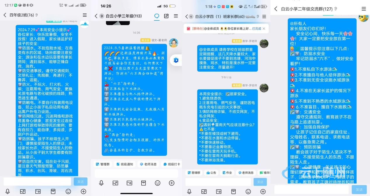 为确保安全提醒的时效性和针对性,白云小学的班主任们在暑期期间坚持在班级群每日推送安全提醒信息。特别是最近强降雨天气现象集中出现在我省,汛期也接踵而至,推送内容涵盖了防溺水、交通安全、网络安全、饮食安全等多个方面,确保学生及家长能够全面掌握各类安全知识,平安度过暑假。