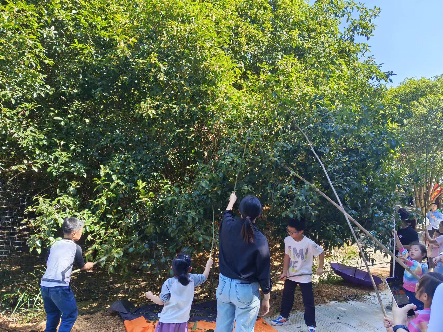 10月2日,在咸安区桂花镇明星村桂花鸡养殖专业合作社,游客和孩子们一起打桂花、捡鸡蛋、画蛋壳画、喝柴火灶土鸡汤,度过惬意的亲子时光。