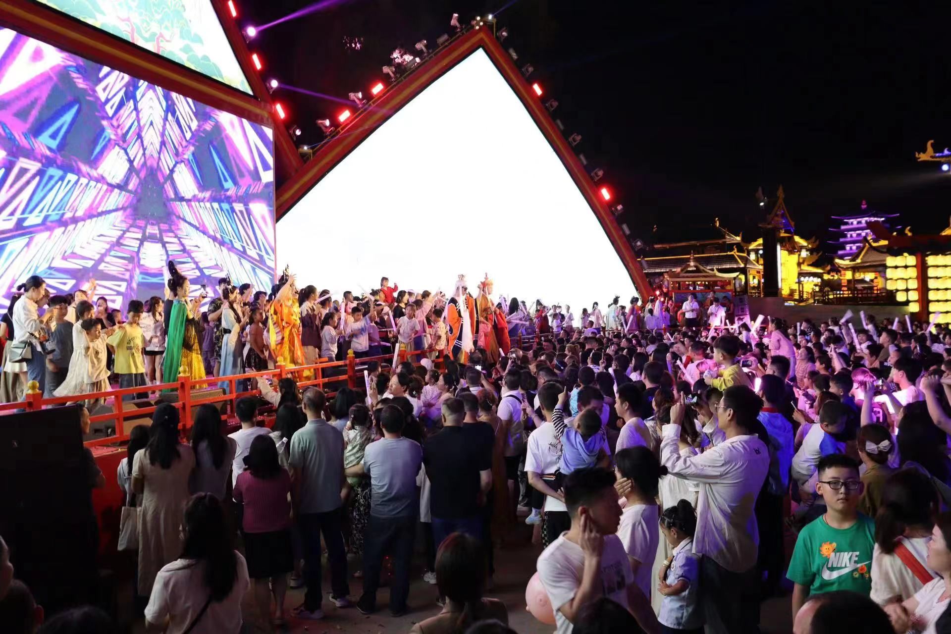 舞台上,乐队激情开唱,狂欢音浪点燃现场,秀出了城市的激情与活力;舞台下,游客们身着自己喜爱的汉服、潮服、舞蹈服,跟着节奏欢呼跳动,秀出自己的热情与开心。