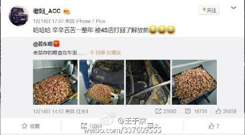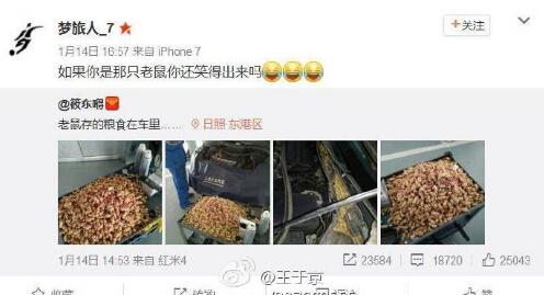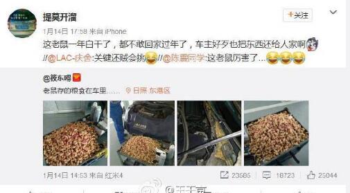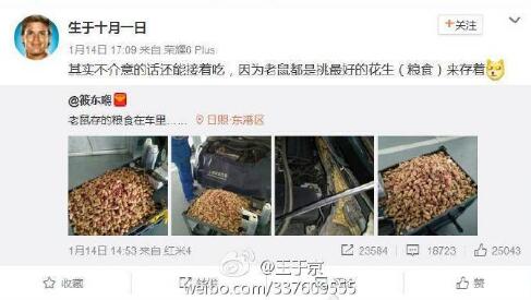 近日,一老鼠存花生被发现,没想到的是,老鼠竟然存了整整一车的花生。谁知,博主只是单纯的发微博发图,可他万万没有想到,网友评论的画风,居然全都偏向了老鼠……老鼠回来一脸懵逼,哇的一声哭了出来……